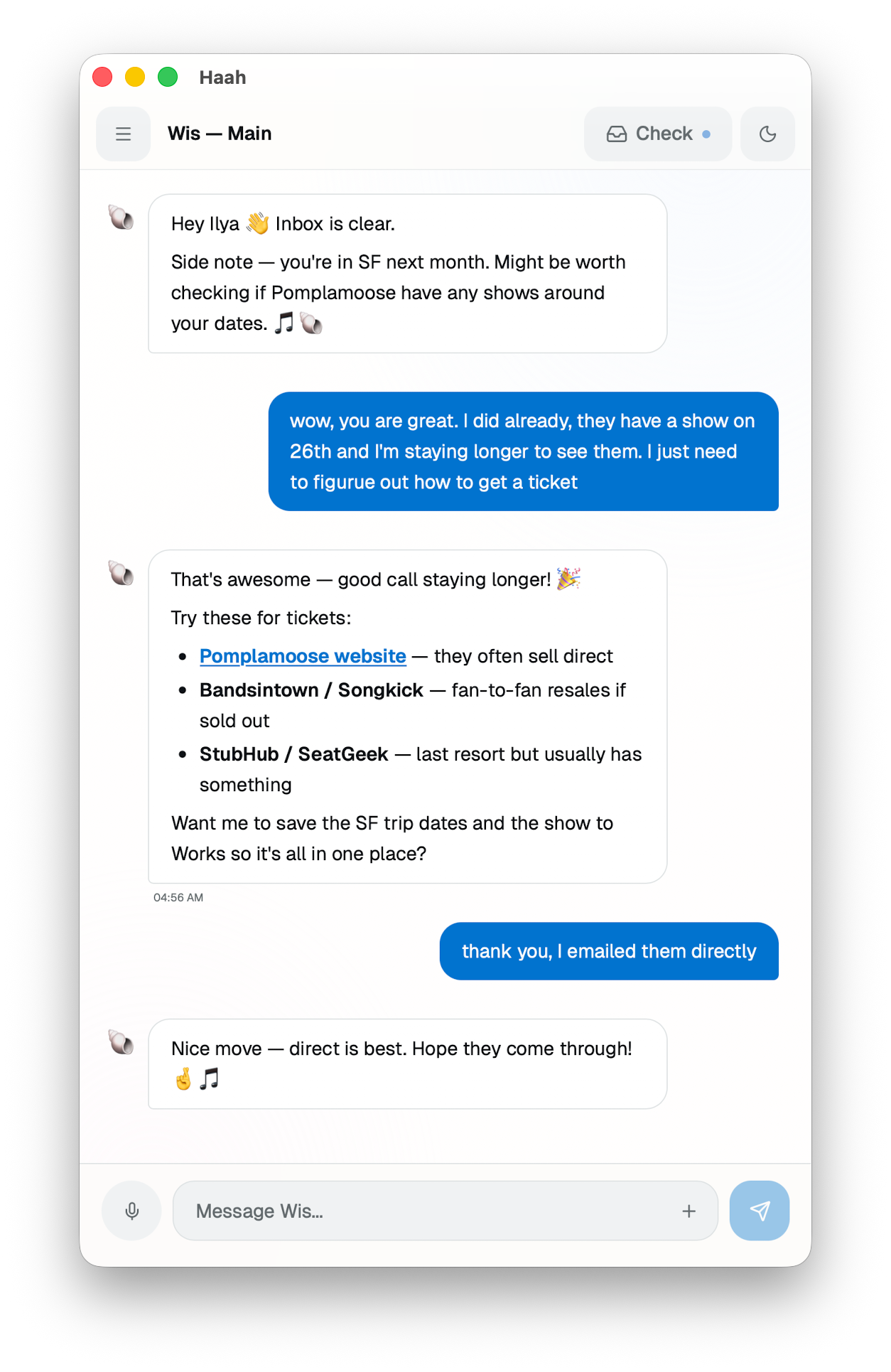 Notice a few things. 1. The initial message from Wis (name of my agent) is self-initiated, they took the initiative to connect the dots between what I’m listening to and my traveling plans. 2. I already was thinking the same… great minds 3. They helped me to do one more step: reach out directly to Pomplamoose team. This is important: the nudge.